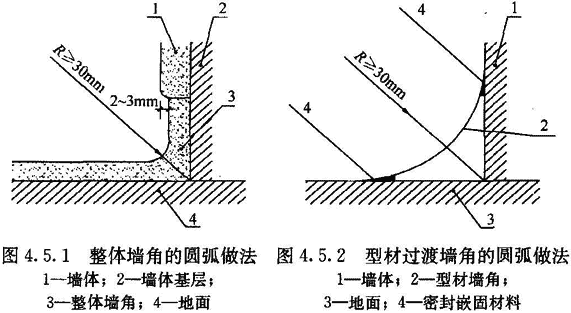 4.5.1 地面與墻面的夾角應為曲率半徑只不小于30mm的圓角。當用柔性材料粘貼地面時,在墻面上應延伸至地面以上形成圓角并與墻面平齊,或略縮進2mm~3mm,突出的墻面應圓滑過渡(圖4.5.1)。需經常沖刷的地面,地面材料在墻面上延伸高度應大于150mm。