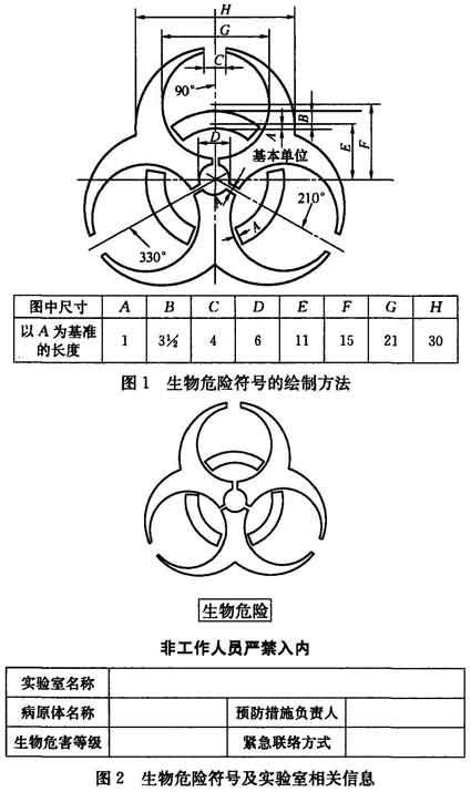 4.2.8 二級、三級、四級生物安全實驗室的操作對象都不同程度地對人員和環境有危害性,因此根據國際相關標準,生物安全實驗室入口處必須明確標示出國際通用生物危險符號。生物危險符號可參照圖1繪制。在生物危險符號的下方應同時標明實驗室名稱、預防措施負責人、緊急聯絡方式等有關信息,可參照圖2。